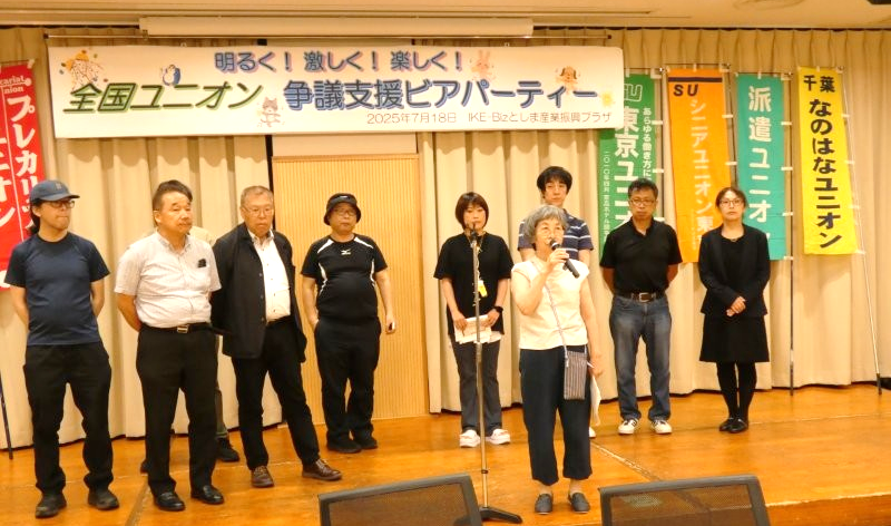 7月18日全国ユニオン主催の恒例争議支援ビアパーティーがIKE-Bizuで開催された。参議院選挙投票日直前であったが、会場には来賓の皆さまや首都圏ユニオンの仲間たちが100名近く集まり、熱気ムンムン。なのはなユニオンからは11名が参加した。